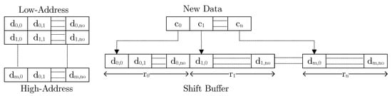 Furthermore, a circular shift-buffer based on low latency memory is designed for the algorithm. As explained earlier, in stereo-matching, the micro-images are selected which lie on the epipolar line, and the baseline distance to choose target micro-images is restricted to 4. Thus in matching process, the same data are accessed multiple times because each pixel needs to be compared with the target micro-image. It establishes the ground to utilize the available memory in an optimized order by removing the redundant memory accesses. The idea is to perform stereo-matching with respect to rows and add the new input data from the external memory only when all the pixels placed on the first column of the buffer finish their respective matching. The memory is arranged from low to high addresses, as shown in left side of the Figure 16. The input data size is R × C, so the buffer size is chosen R ×. Whereby equals to a scalar value that is specified with respect to the available memory. The value of is set 92 in the implementation, because 4 micro-images are considered for the matching whose respective diameter is 23 pixels (Raytrix R5 camera). The data are arranged with respect to rows. When the succeeding column from input image requires to be written in the buffer, the pointer shifts right and the first element of each row is replaced by the respective new data. Subsequently, the shift-counter is increased by one. In this case, index of the buffer to access the last element is equal to the zeroth element index minus the shift-counter.