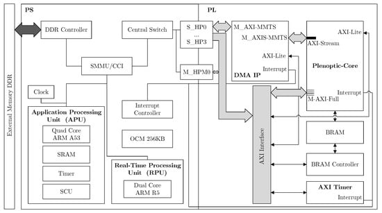 In the proposed design, FPGA is configured as a co-processor where it is not directly connected with an image acquisition logic. The hardware architecture for selected plenoptic camera based algorithm is presented in Figure 17. It is based on Xilinx Zynq UltraScale+ MPSoC that is divided mainly into processing system (PS) and programmable logic (PL). PS consists of a quad-core ARM processor, a dual core real-time ARM processor, a general interrupt controller, memory interfaces and on-chip-memory (OCM). PL contains FPGA configurable logic blocks, resources such as lookup tables (LUTs) and flip-flops (FFs). Furthermore, it contains DSP blocks and Block RAMs (BRAMs). Programmable logic and processing system communicates via high performance (HP) master/slave ports and accelerator coherency port (ACP). Plen-Module represents the depth estimation algorithm module in the system. It is connected with the application processor unit (APU) via AXI_Lite interface and master HP0 port. This interface is responsible for configuring and initializing the module. HP ports are connected directly to the external memory. Plen-Module utilizes available slave HP ports to communicate with memory for reading input data and storing output data. Intermediate results are stored in the BRAM. APU can read BRAM with the help of BRAM controller. Furthermore, Plen-Module is also connected with interrupt controller. Similarly, AXI_Timer is coupled with RPU via AXI_Lite interface. It is used for timing measurement.