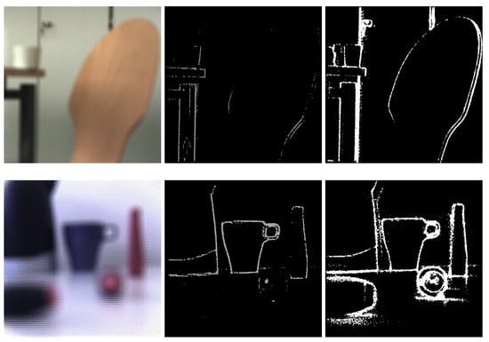 Figure 18 shows two different scenes captured by the camera. The top dataset () represents an indoor scenario consisting of a table and a chair from the perspective of the wheeled walker, whereas the bottom one () depicts objects closer to the camera. Images are arranged as follows: (from left to right) raw image consisting of micro-images, depth map calculated by RxLive and the depth map generated by the presented algorithm. From the figure, it is clear that the latter’s depth map was more dense than the RxLive. The quantitative results calculated by image statistics are listed in the Table 2. The density was computed by dividing the total number of valid depth pixels with the total number of pixels in the given area. It shows that the density of the depth maps estimated by presented algorithm for dataset was ≈52 times more, and for dataset was ≈7 times more than the respective RxLive depth maps. Similarly, presented algorithm’s depth map density for dataset was ≈31% more, and for dataset is ≈21% higher than the respective Zeller et al. [] depth maps. Moreover, the standard deviation of the depth maps from RxLive was slightly better than the presented algorithm.