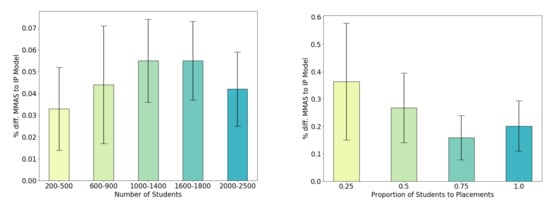 We have considered real problem instances, but it is notable that the number of student placements have been increasing overtime. Moreover, in certain university departments (e.g., nursing), the number of placements to be filled can involve a very large number of students and placements (>2000). A recent survey [] of the placement of students in nurse practitioner programs in the United States found that only 12% of facilities used electronic means for placing students. They comment that ‘an investment in these platforms could reduce faculty time for securing clinical placements’. Discussing a related problem of assigning students to medical schools, ref. [] investigate the need to improve efficiency and reduce costs while ensuring that the pairing of students to medical schools is fair and ensures that students are allocated to suitable schools.