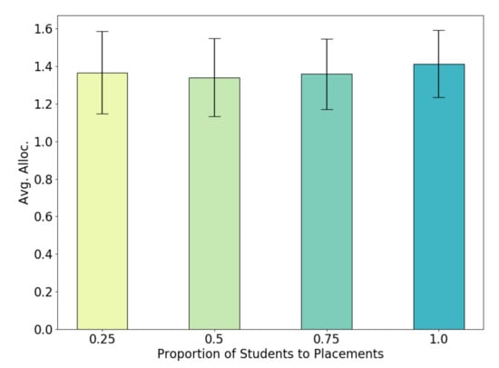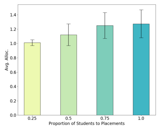 Figure 3 shows a breakdown of the average allocations for the IP model by proportion of student to placements ( [0.25, 0.5, 0.75, 1.00]). In low proportions of placements to students (0.25), we see that the average allocation is always close to 1.0, demonstrating that most of the placements were satisfied with preferences, whereas, when the proportions become higher and there are more placements to fill, it is more difficult for a company to obtain its ideal preference/s. This is expected since if there are very few placements and many students (0.25), several first choice students can be allocated to each placement, whereas, at the other end of the scale with one placement per student (1.0), unless there are many (possibly unique) first choice students for every placement, an average allocation 1.0 can never be achieved.
