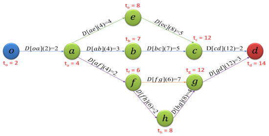 Figure 1 provides an example of a given subgraph H, whose quality indicators as an alternative graph are computed for a given departure time from o. In the example, the computations of the quality quantifications of H are based on the aforementioned functions and specifically for the totalDistance criterion they are grouped by a common denominator with respect to the contained four distinct shortest o-d paths: , , , and . By considering the arcs of the first path, the travel time, the earliest arrival time, and the “share” contribution are determined as follows: