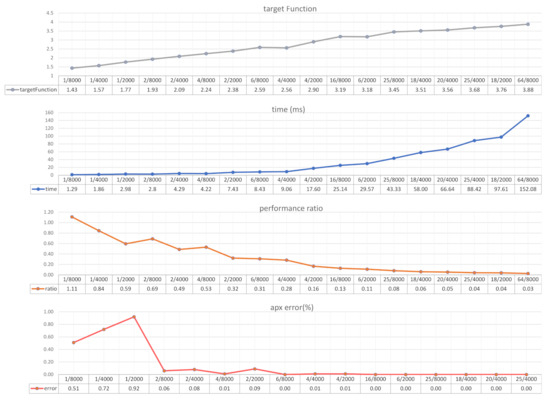 Figure 4 shows the quality (targetFunction) and run time performance of TDAG with respect to the number of landmarks and the selection of N for GE. Each increase of the targetFunction depends on collecting and processing a larger number of candidate alternative paths between origin o and destination d, which, in turn, requires a higher computation time. However, by increasing either or N, the error is reduced. The targetFunction obtains higher values either by a long TDD tree step or by a long predecessor tree step. The first case happens when is smaller—where landmarks are more distant from each other. The second case happens when is larger—where landmarks are less distant from each other.
