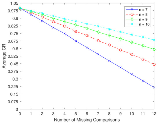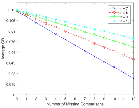 The relations between the number of missing comparisons (k) and their respective average CR are depicted in Figure 3. As it can be seen from all line graphs, they are decreasing for each n while the number of missing comparisons (k) is increasing.