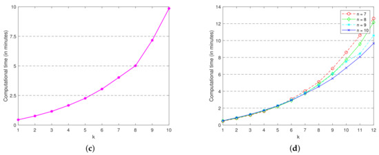 The computation time of the proposed algorithm to reconstruct complete PCMs from the incomplete PCMs and then to calculate the average CR of 10,000 completed PCMs versus to the number of missing comparisons k corresponding to Table 4 for matrices of size is shown in Figure 5. The computation time is calculated using MATLAB’s tic-toc function. As can be seen in Figure 5, at each matrix size n, the computation time increases when the number of missing comparisons (k) increases. Note that the execution time excludes the formation of the initial and incomplete matrices in the process.
