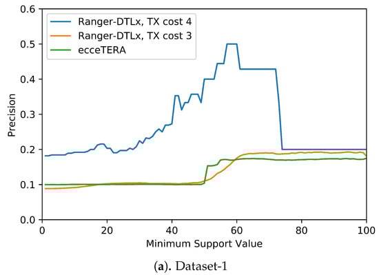 We also assessed if inferred events that have higher support (i.e., are inferred in at least some fraction of all optimal reconciliations for that gene tree) are more likely to be correct (i.e., show higher precision). Figure 5 shows the results of this analysis. These results suggest that higher support values do tend to result in greater precision. More precisely, we find that RANGER-DTLx with cost 3 and ecceTERA both shown similar trends in precision, with precision on Dataset-1 increasing from a low of about 0.1 for all inferred events irrespective of support to a high of about 0.18 if only considering events with 100% support, and precision on Dataset-2 increasing from about 0.1 for all inferred events irrespective of support to a high of approximately 0.25 if only considering events with 100% support. However, as expected, the increase in precision comes at the expense of recall (Table 4). For example, on Dataset-2, RANGER-DTLx with cost 3 infers a total of 14,134 distinct events with support among 100 optimal reconciliation samples but only 940 of these have 100% support, and the corresponding numbers for ecceTERA are 12,884 and 2088, respectively. Remarkably, as Figure 5 shows, RANGER-DTLx with cost 4 achieves a precision of almost 50% on Dataset-1 and over 40% on Dataset-2 when using a support threshold of about 55%. However, as Table 4 shows, the number of events inferred at that support level by RANGER-DTLx with cost 4 is relatively small. The small number of these events likely explains the drop in precision for RANGER-DTLx with cost 4 as the support threshold in increased past ∼60.