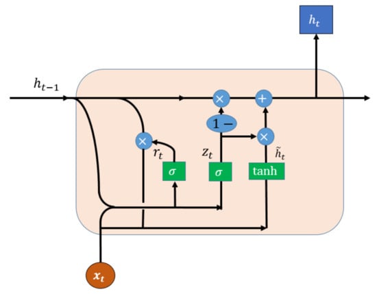 Like LSTM, GRU is another improved version of the standard RNN. To solve the vanishing gradient problem of a standard RNN, GRU uses an update gate and reset gate. These are two vectors that decide what information should be passed to the output. The special thing about them is that they can be trained to keep information from long ago without washing it through time or to remove information that is irrelevant to the prediction. To explain the mathematics behind that process, we will examine a single unit of GRU given in Figure 3 [,].