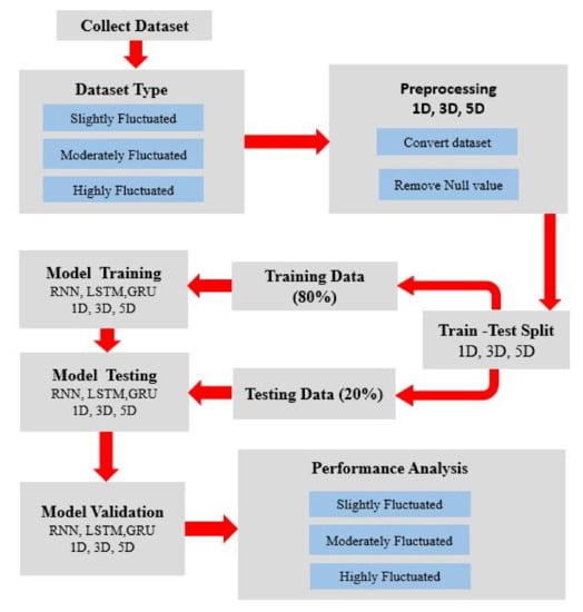 In this research, we have analyzed the effectiveness of Recurrent Neural Networks (Simple RNN, LSTM, and GRU) while predicting different types of stocks’ price movements. Specifically, we considered three types of datasets—highly fluctuated, moderately fluctuated, and slightly fluctuated—and the prediction was done for three different time intervals: one day, three days, and five days. Figure 4 shows the system architecture of our proposed model.