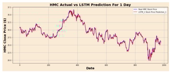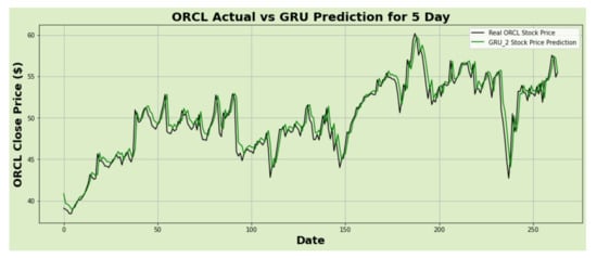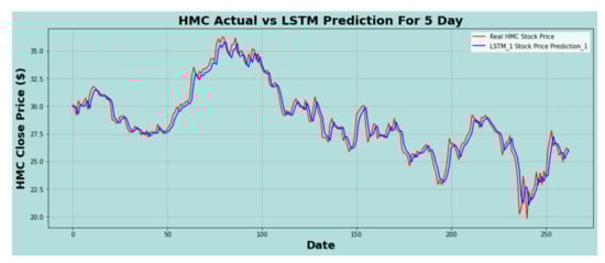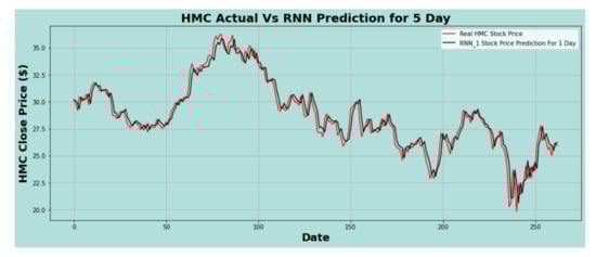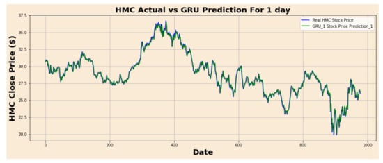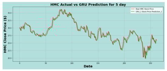 Figure 11, Figure 12 and Figure 13 show the actual vs. predicted curves for five-day time intervals of HMC. GRU outperformed the other two models in this timeframe as well. The results are summarized in Table 6.
