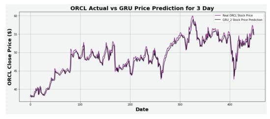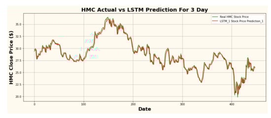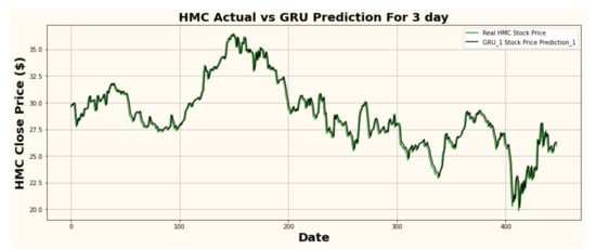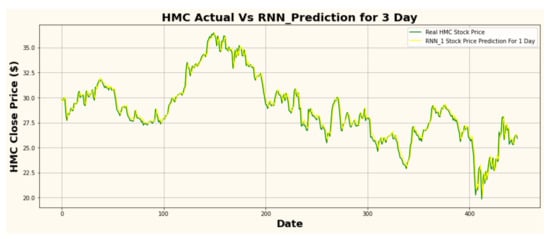 Actual value vs. predicted value curves for a three-day time-interval of HMC are shown in Figure 8, Figure 9 and Figure 10 where GRU performs better than RNN and LSTM. However, all of them produced slightly larger errors than one-day time-interval, as shown in Table 5.