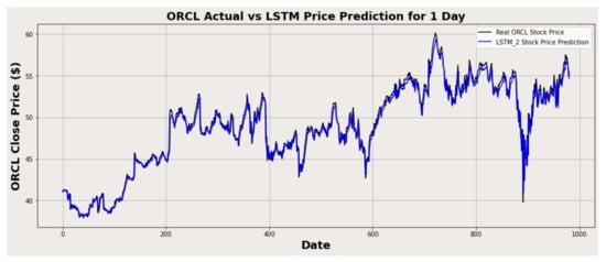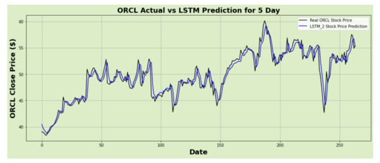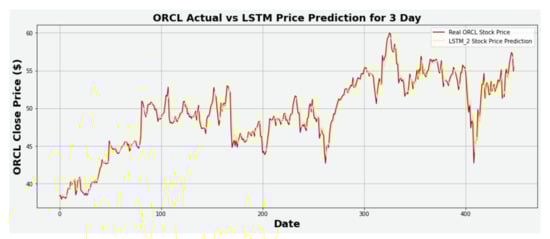 In case of ORCL dataset, LSTM performs better than RNN and GRU models. The actual vs. predicted value curves of a one-day interval are shown by Figure 14, Figure 15 and Figure 16, of a three-day interval are shown by Figure 17, Figure 18 and Figure 19, and of a five-day interval are shown by Figure 20, Figure 21 and Figure 22. Table 7, Table 8 and Table 9 summarize the performance of one-day, three-day, and five-day intervals, respectively.