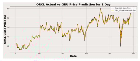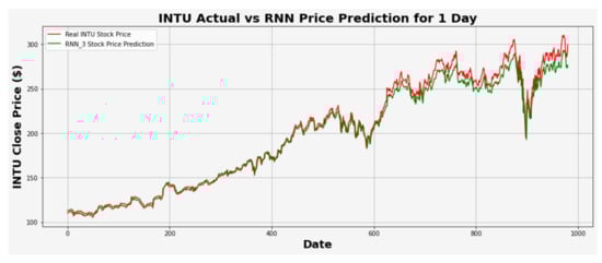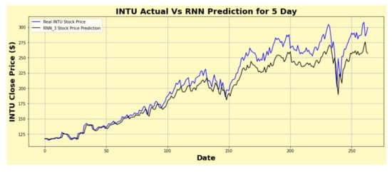 Based on the results of the previous three subsections, it is evident that RNN is outperformed by LSTM and GRU in stock price prediction. The reason is that both LSTM and GRU are advanced versions of traditional RNN and provide more controlling knobs, which control the flow input based on the training weights. This gives LSTM and GRU more flexibility to control the output and thus improve the performance. Another reason is that RNN suffers from the vanishing gradient problem, which may cause RNN to stop being trained if the learning rate is too low. However, with the help of update gate, forget gate, and reset gate, LSTM and GRU can avoid this problem []. Moreover, in terms of highly fluctuating data (INTU), although LSTM can closely identify the trend ( value is close to GRU), it produces very large errors compared to GRU for all timeframes. Furthermore, in our research, we applied our methods on three types of data (highly fluctuating, moderately fluctuating, and slightly fluctuating) where highly fluctuating data are of the non-stationary type. High value indicates better fit to the regression model, and thus better prediction can be made, which is our ultimate goal in this research work. For non-stationary-type data in our analysis, we achieved very high rate of value for every method in each time frame, which is shown in Table 10, Table 11, and Table 12. It can therefore be said our methods are robust to non- stationary data as well.