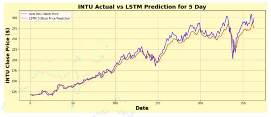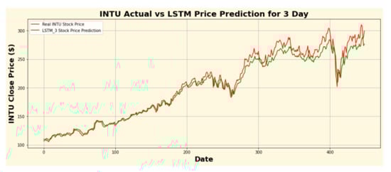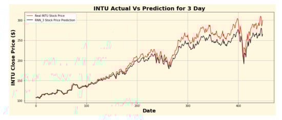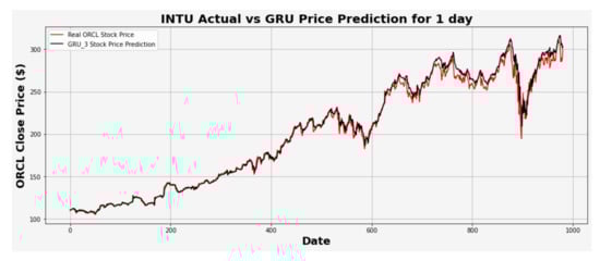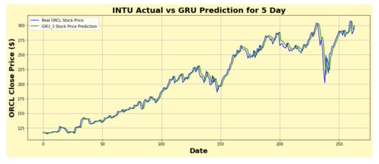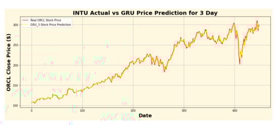 GRU establishes its superiority in all time intervals in the case of the INTU dataset. Figure 23, Figure 24 and Figure 25 represent the actual vs. predicted value curves of a one-day interval, Figure 26, Figure 27 and Figure 28 represent the curves of a three-day interval, and Figure 29, Figure 30 and Figure 31 represents the curves of a five-day interval. The values of performance metrics are summarized in the Table 10, Table 11 and Table 12 for one-day, three-day, and five-day intervals, respectively.
