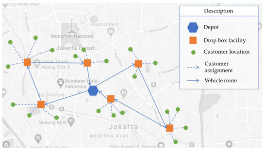 Testing data was taken from a drop box dataset located around the Jakarta area [31], and reverse geolocation is carried out using the Google API to obtain its latitude and longitude. For customer locations, uniform random distribution using python programming is carried out around the drop box locations within a radius of 10 km. For small instances, the number of drop box facilities ranges from 5 to 30 and the number of customers ranges from 6 to 25. Meanwhile, for large agencies, the number of drop box facilities is 92, and the number of customers ranges from 70 to 150. After obtaining the drop box facilities and customers’ location, the distance between the drop box facility and the customer is calculated using the haversine formula.