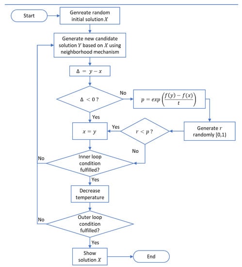 In the SA algorithm, there are two phases: the initiation phase and the improvement phase. The initiation phase begins with determining the initial solution X, which is carried out randomly. In this phase also, the temperature T is set to the initial temperature T0 and the best solution of X is denoted by XBest. Then, the new solution Y is generated based on the initial solution X in the improvement phase. After obtaining a new solution Y, then Y is compared with X. If the objective value of Y is better than X, then X will be replaced by Y. On the other hand, the SA algorithm will be used to calculate formula (12), denoted by p, to help determine whether Y will replace X or not. Then, it will look for a random value between 0 to 1, symbolized as r. If the value of r is less than p, then X will be replaced with Y. At each iteration, XBest is updated if there is a new best solution found. After Iiter number of iterations, the temperature T is updated using formula (13). The SA algorithm will stop when the temperature T is less than the final temperature Tf. The overall process of SA is shown in Figure 2.