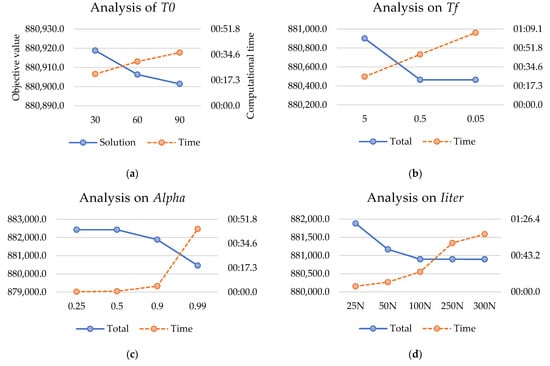Figure 4a shows the experimental determination of the T0 parameter, while the other parameters are fixed. The T0 determination experiment shows the number 90 in the search for the minimum objective value in an acceptable time. Then the search for the Tf parameter was carried out with the value T0 = 90, and the other parameters were fixed. Figure 4b shows that the obtained Tf is equal to 0.5, in order to obtain a minimum objective value, also in an acceptable time. For the Alpha and Iiter parameters the same procedure is used as T0 and Tf. After setting the parameters, from the experimental results, the values of T0 = 90, Tf = 0.5, Alpha = 0.99, and Iiter = 100N. After all these processes, the final parameters are as follows: T0 = 90, Tf = 0.5, Alpha = 0.99, and Iiter = 100N. Figure 4 shows the analysis of the effect of each SA parameter on the objective value and computation time.