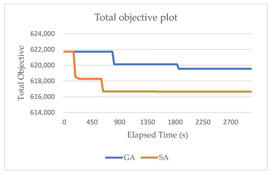 Figure 5 shows the convergency of the SA and GA algorithm in finding a solution at a predetermined time, from 0 s to 3000 s. From 0 to 300 s, it is shown that both the SA and GA algorithm is able to search for minimal solutions. For SA, there is a drastic change in the solution at 240, with a total objective of 618,378 and 616,670 in 630 s. Later in the iteration, the SA algorithm made good improvements, but progressing slowly as it approached steady-state. At the final part of the iteration, the SA algorithm shows the same solution until the end of the experiment and shows a convergence property. Meanwhile, GA shows a slower process than SA. The improvement of the solution in GA is shown at 840 and 1890 s with the objective value of 620,123 and 619,556, respectively. At the final part of the iteration, GA also shows the same solution until the end of the experiment and shows a convergence property.