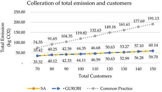 In a further analysis regarding emission costs, the computational results from the 2EVRP-DF model were promising compared to common practice. Table 6 shows the detailed emission calculations for the 2EVRP-DF model and common practice. The 2EVRP-DF model shows that the average total emissions produced by vehicles in the first and second echelon are 47.80 (GUROBI) and 47.56 (GUROBI), where the total emission in common practice averages 133.60. Furthermore, Figure 6 shows that, as more customers are added to the system, the amount of carbon emissions also increases. However, when compared to the 2EVRP-DF model, common practice generates much higher emission costs compared to the 2EVRP-DF. For this reason, it can be concluded that the 2EVRP-DF model can have a positive impact on the environment by reducing the amount of carbon emissions released by vehicles.
