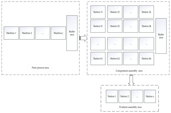 The hybrid mixed-flow workshop is composed of three parts: the first part is the parts-processing workshop, which is produced in batches; the second part is the flow shop of the component-assembly workshop, which is assembled in units; the third part is the flow shop for the final assembly of the product, which is assembled in units, as shown in Figure 1 below.