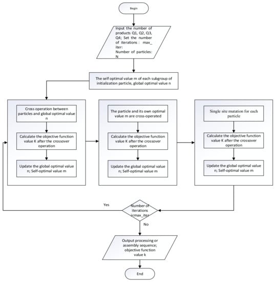 Enter the number of artifacts to generate N (total number of particles) random artifact sequences. After crossover and mutation with the global optimal value and its own optimal value, respectively, filter and update the one that can produce a better target value particle. In this step, the crossover and mutation operations can be regarded as random walk operations on the permutation group of the workpieces arranged in order. The mutation is a single-step walk of exchange and the crossover can be a walk formed by a combination of multiple basic exchanges. This step is similar to the speed update in the classic PSO. Whether to perform a walk is only True or False in this algorithm. This step simulates the weighting factor [27] in the classic PSO. Crossing with the local (self) and global optimal values, respectively, simulates the two velocity terms in the classic PSO. Both the mutation and crossover operations have a certain degree of randomness, which ensures that a single particle can jump out of the local optimal solution possibility.