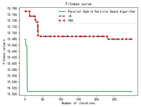 It runs in a 64-bit stand-alone Windows 10 operating system, 32 G running memory, 10 cores and 20 threads. In Spark’s Local mode, parallel computing of algorithms is realized. In the case of local[N] mode, the optimal plans for the assembly scheduling of parts, components and products are obtained, respectively, {E1, G1, F1, D1, G2, D2, F2, B1, F3, C1, F4, A1, H1, A2, E2, C2, B2, A3, D3, H2, H3, G3, B3, D4, H4, B4, C3, E3}; {X1, X2, Y1, Y2, Y3, Y4, X3}; {Q3, Q1, Q1, Q3, Q2, Q4, Q4}; the total completion time is 15,508 s. Using the immune genetic algorithm IA [15], the total completion time is 15,679 s. Using the PSO algorithm, the total completion time is 15,660 s. Figure 3 shows the evolution curve of this algorithm.
