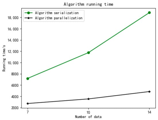 To test the parallelization performance of the hybrid particle swarm algorithm, set the population to 20 and the number of iterations to 40. Compare the running time of algorithm serialization and algorithm parallelization. The tested data are as follows: when the number of products is 7, the ratio of products is [2:1:2:2]; when the number of products is 10, the ratio of products is [2:3:2:3]; when the number of products is 14, the ratio of products is [3:4:5:2]. Compared with the running time of algorithm parallelization and algorithm serialization, the computing speed is greatly improved by 2–4 times. As the number of products input increases, the speed increases more obviously, reflecting the advantage of the Spark platform in processing a large amount of data. The running time of the algorithm is shown in Figure 4 below.