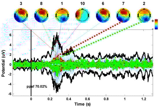 Then question, then, is how to describe emotional changes in long-term brain activity. The EEG is a complex non-stationary random signal which is easily disturbed by the external environment and subject movement []. At present, the most commonly used methods of EEG analysis are event-related processing methods such as event-related potentials (ERP), event-related synchronization (ERS), and event-related desynchronization (ERD) []. The principle is that the specific stimulus could cause regular potential changes in the brain. Therefore, neural activity in the cognitive process could be measured through the electrophysiological changes of the brain []. Poikonen et al. [] successfully extracted the N1 and P2 components caused by music through the ERP technique. The potential changes are similar to the same type of stimulus, while the noise in response is random. Therefore, the ERP component could be obtained, and the random noise balanced out, by large amounts of superposition and averages of EEG, as shown in Figure 1. The horizontal axis represents time and the vertical axis represents voltage amplitude. Furthermore, by analyzing the contribution of the ERP component, the EEG component that has the largest contribution could be found. The numbers (1, 3, 4, 7, 8, 11, and 13) on the topographic maps are the index of the independent components of EEG signals, which were obtained by Independent Component Analysis.