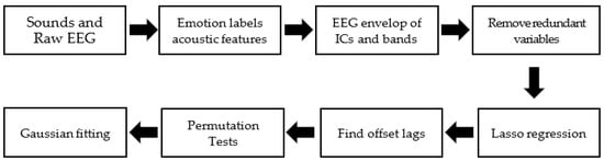 The process of the method proposed in this article is shown in Figure 2. It mainly included the following four steps: (1) extracting the acoustic features of the audio and finding the emotion-related acoustic features based on correlation analysis; (2) ICA decomposition and features extraction of EEG signals; (3) time-varying regression analysis between acoustic features and EEG components; and (4) finally, looking for the most relevant emotion-related EEG components by permutation tests and Gaussian fitting.