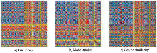 The similarity matrices of the same feature (zero crossing) were calculated respectively by using (a) Euclidean distance, (b) Mahalanobis distance, and (c) Cosine similarity. A dark color means similar and a bright color means dissimilar. The sum value of dissimilarity by cosine was higher than the euclidean and mahalanobis distances.