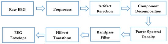 It is widely known that the EEG component is very weak, and the noise is very strong. As the EEG signal is only about 50 mV, preprocessing is necessary. The process of EEG signal processing is shown in Figure 4.