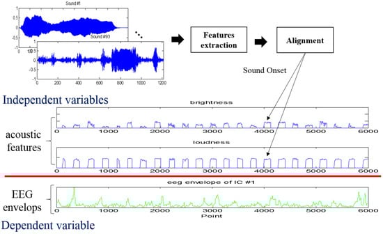 The multiple regression analysis was performed based on the EEG components and sound features of the time series. The independent variables were the acoustic features, and the dependent variable was the EEG component of each IC and band.