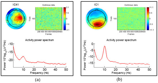 The most relevant emotion-related long-term brain components. (a) is the IC#41 in the alpha band, (b) is the IC#1 in the beta band.