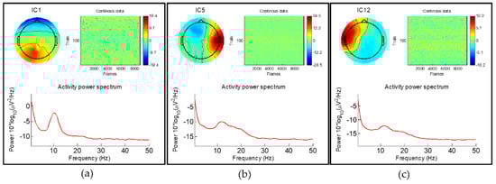 The significant brain components selected by the Gaussian fitting. (a,b) are the IC#1 and #5 in the alpha band, and (c) is the IC#12 in the beta band.