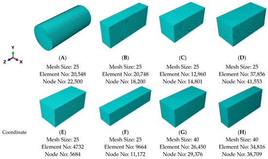 To determine the appropriate mesh size for the analysis of the RC column, three sizes of finite element mesh were selected, and mesh sensitivity analysis was performed. Several attempts were made to reach the finite element results that coincide with the experimental results. However, independence to the mesh size will be considered by this technique. The discretization of concrete is shown in Figure 2.
