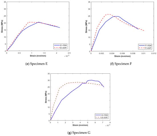 As stated previously, the experimental results of specimens are compared to finite element results. The strain-stress diagrams and the maximum corresponding values are shown in Figure 3 and Table 2. The results corresponding to specimen H are not reported in this table because of the inconvenience with the data acquisition system in the last step of the loading. Therefore, there is no record of the maximum axial strain [48]. In Figure 3 and Table 2, the difference of finite element compared with experimental results shows that the maximum stress and strain for specimen A (Figure 3a) is 11.5 and 2.5 percent, respectively. In Figure 3b, it is clear that the strain-stress diagram for both stress and strain parts is closely intertwined by having 4.9 and −6.6 percent. It should be noted that the minus factor indicates the finite element’s maximum value is less than the experimental one. In Figure 3c,d, although the trend of the plastic part is not well matched, the difference of maximum stress is 2.5 and 0.6 for specimens C and D, respectively. Based on Figure 3e–g, and Table 2, it can be seen that the validation of these specimens is reasonable by having 5.3, −4, and 2.5% as the strain difference, and 5.4, −7, and 2.5% for the difference of maximum stress. Moreover, the small difference of FEM and experimental results could reasonably be a result of the nature of experimental setups. In fact, the laboratory tests can have reading errors of strain gauges, load cell and/or the failure of the concrete element that could cause higher/lower results. Therefore, having approximately 10% or less difference between the FEM and experimental results is indicative of a good agreement.
