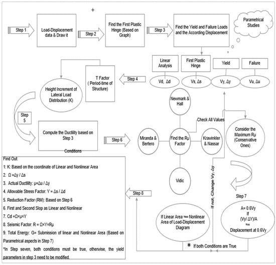 As can be seen in this figure, the first step is to add the load-displacement diagram. This diagram is added based on finite element results. The second step is to find out the first plastic hinge. The plastic hinge usually occurs after the crack tip and at the time of crack propagation. It is worth mentioning that the plastic hinge is automatically calculated with the developed script. In step three, the developed script is defined to calculate the yield and failure load and corresponding displacement. In the next step, the time and “k” factor are defined. In step five, the data of step three are employed to calculate the ductility factor. Step six is scripted to choose a different method of computing factor of “R”. In the final steps (seven and eight), the accuracy of all previous steps is determined, based on two main conditions (see step eight). In fact, these eight steps are subjected to recursion to achieve the required accuracy.