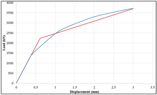 Furthermore, the stiffness can be computed in a similar way to the mentioned methodology. Considering the concept of Figure 5, the yield force and its corresponding displacement can be computed. Thus, the stiffness can be determined by Equation (4) which requires finding first the slope of the load-displacement diagram [52].