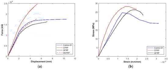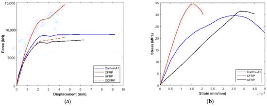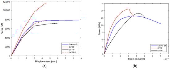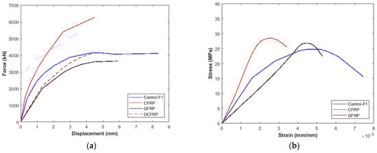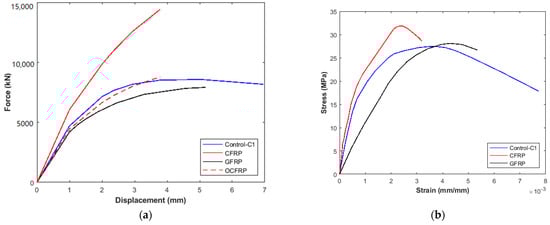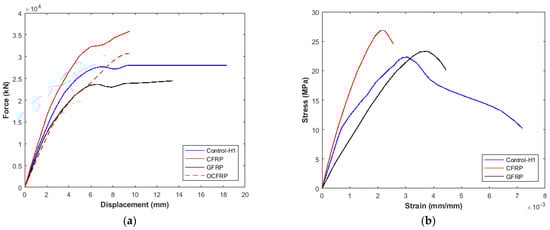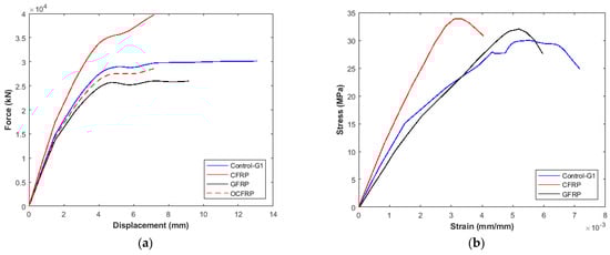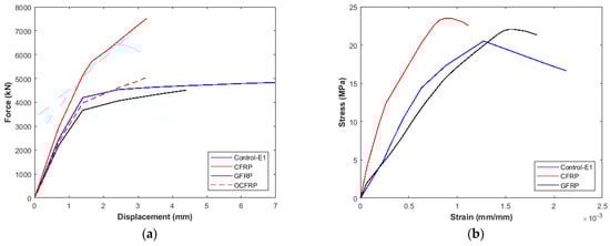 In Figure 13, the load displacement and stress-strain diagrams of group G are shown. In this figure, the CFRP model has about 40 kN load capacity, while the value for control, GFRP and OCFRP is about 30 kN, 24 kN and 28 kN, respectively. Moreover, the maximum displacement of the CFRP model shows about 47% reduction compared with that of the control model. In terms of failure strain, control samples have the maximum strain (about 0.007) compared with CFRP (0.004) and GFRP (0.0055).