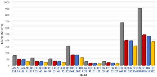Based on the parametrical investigation, the energy absorption values are shown in Figure 15. It is clear that group H holds the highest energy absorption due to its dimensions. However, the CFRP bar has better behavior in enhancing energy absorption compared to GFRP. However, the models with steel bars have better energy absorption due to yield and failure points of steel material. To investigate the effect of the cross-section, group D (648 × 648 mm) and F (324 × 324 mm), and the height of 1.4 m are compared. The energy absorption of DC was about 184% higher than FC. The values were 159 and 56, respectively. Also, DG has 364% more energy absorption value than FG. On the other hand, it is necessary to compare the energy absorption of each group to evaluate the effect of each specimen. In Figure 15, the circular section (Group A: 508 mm) indicates that the AS specimen has more energy absorption than AC and AG, which shows the energy absorption of (153.77 ) 63 and 75 percent more than AC and AG, respectively.