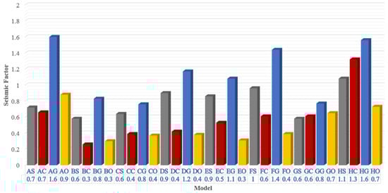 Figure 16 shows the seismic factor of specimens. By comparing the seismic factor in Figure 16 between group B ( mm) and F (, both of which have the same height (1.4 m), it can be seen that the seismic value of BS is 90%higher than that for FS. Furthermore, comparing BG and FG, the seismic value increases with the increase in the cross-section (4.9 and 2.9, respectively). Furthermore, comparison between group E and F, which have the same cross-section mm and different heights (E = 0.7 and F = 1.4 m) demonstrates that the higher the height, the lower the seismic factor is. The results from groups E and F show that the seismic factor of FS is 12% higher than ES, while this difference for FG and EG is 33%. In order to compare the effect of cross-section, group D ( mm) and F ( mm) is chosen. These groups have the same height (1.4 m). The results show that the difference of the seismic factor is too closed, meaning that the cross-section does not have a big influence on the seismic factor (However, the smaller cross-section has better performance in seismic factor). As a case in point, FS is 6.6% more than DS, and this difference for optimized model FO and DO is subjected to have 0.39 and 0.38 which is less than 2.7%.