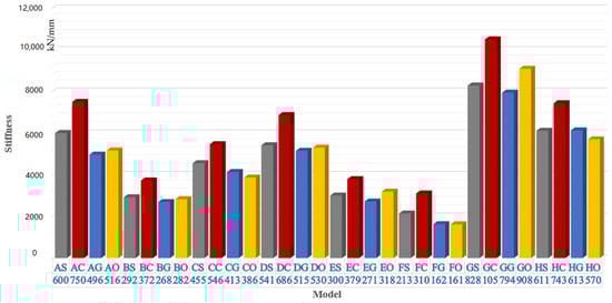 In Figure 17, the stiffness of all models is shown. By comparing groups of steel, carbon and glass bars, it can be declared that carbon bars have better performance in enhancing the stiffness. This may be due to the mechanical properties of carbon fiber reinforced polymer bars. On the other side, the stiffness of steel bars is much higher than that for the glass groups. This is because of the much higher modulus of elasticity of steel (200 GPa) in comparison to 51 GPa for glass bars. In order to evaluate the detailed comparison of stiffness based on cross-section parameters, groups D and F are selected. As \mentioned above, these group have the same height, but the cross-section of D is twice that of F (The comparison of FS and DS shows that DS has more stiffness than FS (about 153%); also this difference for the carbon and glass model is 120% and 215%, respectively). On the other hand, comparing group E (0.7 m) and F (1.4 m) and having the same cross-section shows that the stiffness of ES is about 40% higher than FS. Also, the difference of stiffness is 22% (EC vs. FC), 67% (EG vs. FG) and 97% (EO vs. FO). Comparing the two largest groups also shows that the square cross-section has higher stiffness than the rectangular ones. To approve this issue, GC and HC are compared, and GC is shown to be about 41% of HC.