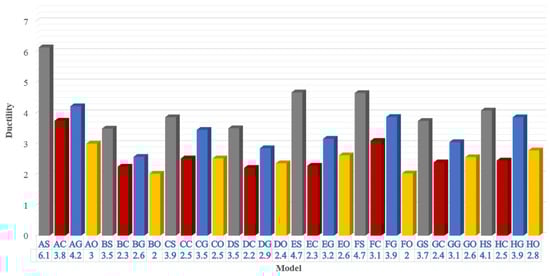 In contrast to stiffness, the ductility parameter, shown in Figure 18, of the steel group is more than that for both glass and carbon. In fact, the steel bars have better performance in increasing the ductility factor than CFRP and GFRP bars. The comparison of group B and D displays that the rectangular shape has better performance in improving the ductility factor (For instance, BC and DC have 5.5 and 3.7). The height factor is also an issue for the parametrical studies. The results have shown that an increase in the height can enhance the ductility factor. This is evident in specimens EC and FC with values of 4.2 and 4.9, respectively. The heights of group E and F were 0.7 and 1.4 m, respectively. The bottom line is that the circular cross-section has the highest ductility among all groups. Comparing the ductility of AS with the second highest steel specimens (ES and FS) shows that this difference is about 30% for AS compared to the two others. Moreover, this difference for carbon, glass and the optimized model is 22.5%, 7.6%, and 7.1%, respectively.