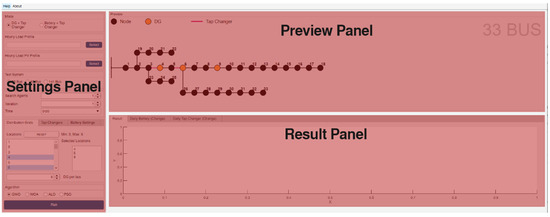 The toolbox runs on MATLAB and was developed using the MATLAB App Designer tool. There are two different modes of simulation in the application. In the first mode, the toolbox minimizes the voltage deviation using DG and the tap changer; in the second mode, the toolbox minimizes the voltage deviation using BESS and the tap changer. The user should specify different information such as the number of iterations, the number of search agents, DG, BESS, and tap changer positions depending on the mode selected. The program uses 33-, 69-, and 141-bus test systems during the analysis. As can be seen from Figure 3, the toolbox consists of three panels. The first of these panels is the settings panel to control program settings. The second is the preview window, which displays the drawing of the selected test system. The last one is the results window, which displays the optimization results.