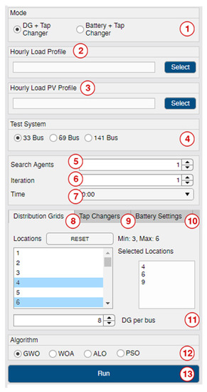 This panel allows you to adjust the settings. The user can change the optimization model, system load information, locations, and the numbers of DGs, tap changers, and BESSs here. Figure 4 shows a screenshot of the panel. We show different setting groups with numbers from 1 to 13.