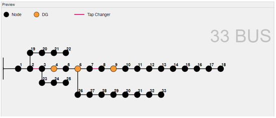 A visual preview of the DGs, BESSs, and tap changers placed in the selected distribution system appears in the preview window. In the visual preview, the bus locations and lines are shown in black, while DGs and BESSs in the system are shown in orange, and the tap changers are shown in red. DG and BESSs are located at the bus positions and the tap changers are located at the lines. Figure 5 shows a screenshot of the preview panel.