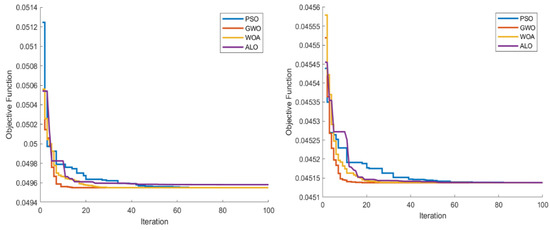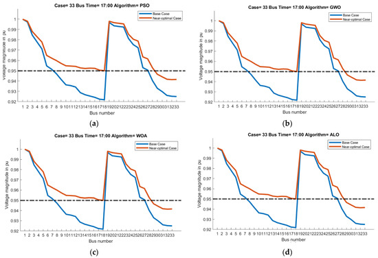 We ran simulations for Model I and Model II using a 33-bus test system. We set the number of search agents to 50, the number of iterations to 1000, and placed 8 PVs at each bus 15, 16, 19, 20, 25, and 33. The results of PSO, GWO, WOA, and ALO-based optimization are shown in Figure 6. In all the results, it could be seen that the final voltage magnitudes values have improved.