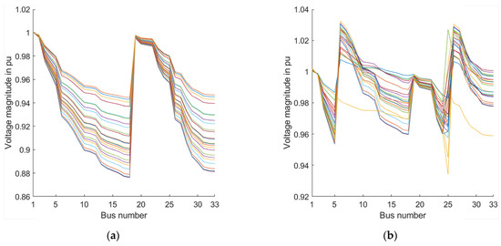 Daily, (a) base case, and (b) near-optimal voltage magnitudes when BESSs and tap changers are used.