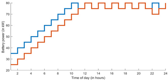 For the simulations we run with Model II, we set the number of search agents to 50 and the number of iterations to 100. The initial power of the BESSs and their step values are set to 30 kW and 5 kWh, respectively. The lower and upper limits of SOC are 20 kW and 80 kW, respectively. There are tap changers on the line between the 5th and 6th buses and 24th and 25th buses. The two BESSs are installed on buses 5 and 13, and each BESS has the same characteristics, such as the initial value and SOC limits. We perform the tests using the GWO algorithm on a 33-bus test system. Figure 7 shows the improvement of the daily voltage profile when BESSs and tap changers are used. Figure 8 and Figure 9 illustrate the daily change in the power states of the BESSs and the daily change in the tap changer settings.