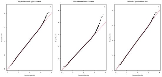 Finally, we rely on normalized quantile residuals [] as an exploratory graphical tool to help us evaluate the adequacy of the fit of the NBI, ZIP, and PLN models. For these discrete response distributions, the normalized (randomized) quantile residuals are defined as  where  is the inverse cumulative distribution function of a standard normal distribution and where  is defined as a random value from the uniform distribution on the interval , where  is the cumulative distribution function estimated for the ith policyholder, and where  contains the estimated model parameters after the EM algorithm has reached the global maximum, and  is the corresponding observation. The fit of the claim count model can be evaluated by means of the usual quantile-quantile plots. Specifically, if the data indeed follow the assumed distribution, then the residual on the quantile-quantile plot will fall approximately on a straight line. Figure 1 shows the normalized (random) quantiles for the ZIP regression model and the NBI and PLN claim frequency regression models with varying dispersion.