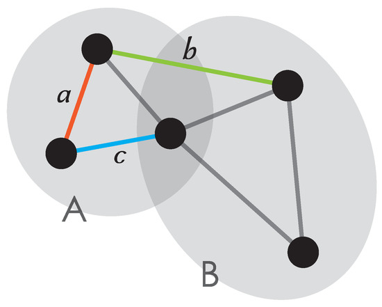 However, in the case of overlapping communities, an edge can be ambiguous, which can hardly be defined as being inside or outside the community. As shown in Figure 1, edge a is an internal edge in community A, and edge b is an inter-community edge between communities A and B. However, edge c can be considered either as an internal edge of community A or as an edge between communities A and B because the nodes at both ends of such an edge can either belong to the same community A or to two different communities A and B. This makes it difficult to count the number of edges and calculate the probability distributions in Equations (4)–(11).